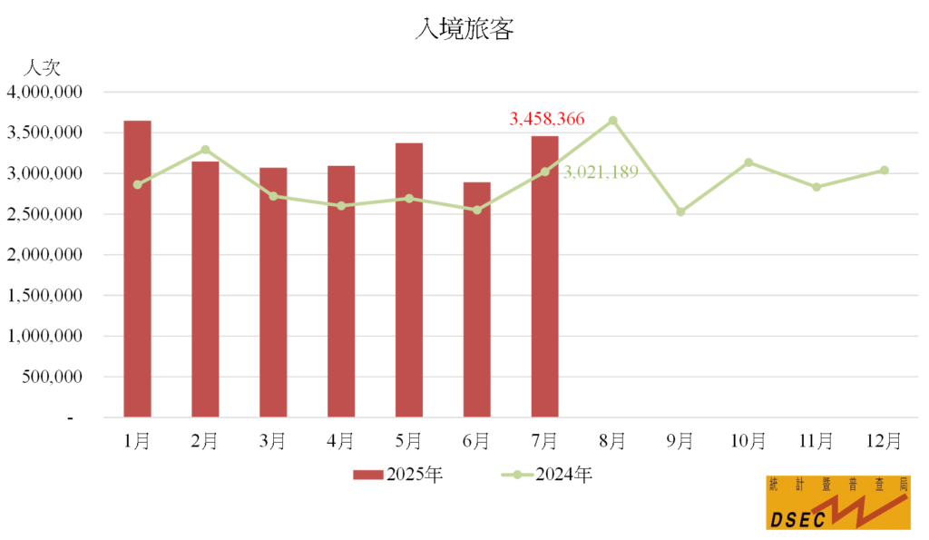 【本報訊】統計暨普查局資料顯示,2025年7月入境旅客共3,458,366人次,按年上升14.5%。不過夜旅客(1,980,732人次)與留宿旅客(1,477,634人次)較去年同期分別上升24.1%及3.7%。旅客平均逗留時間為1.2日,按年持平;留宿旅客(2.4日)維持不變,不過夜旅客(0.2日)則減少0.1日。