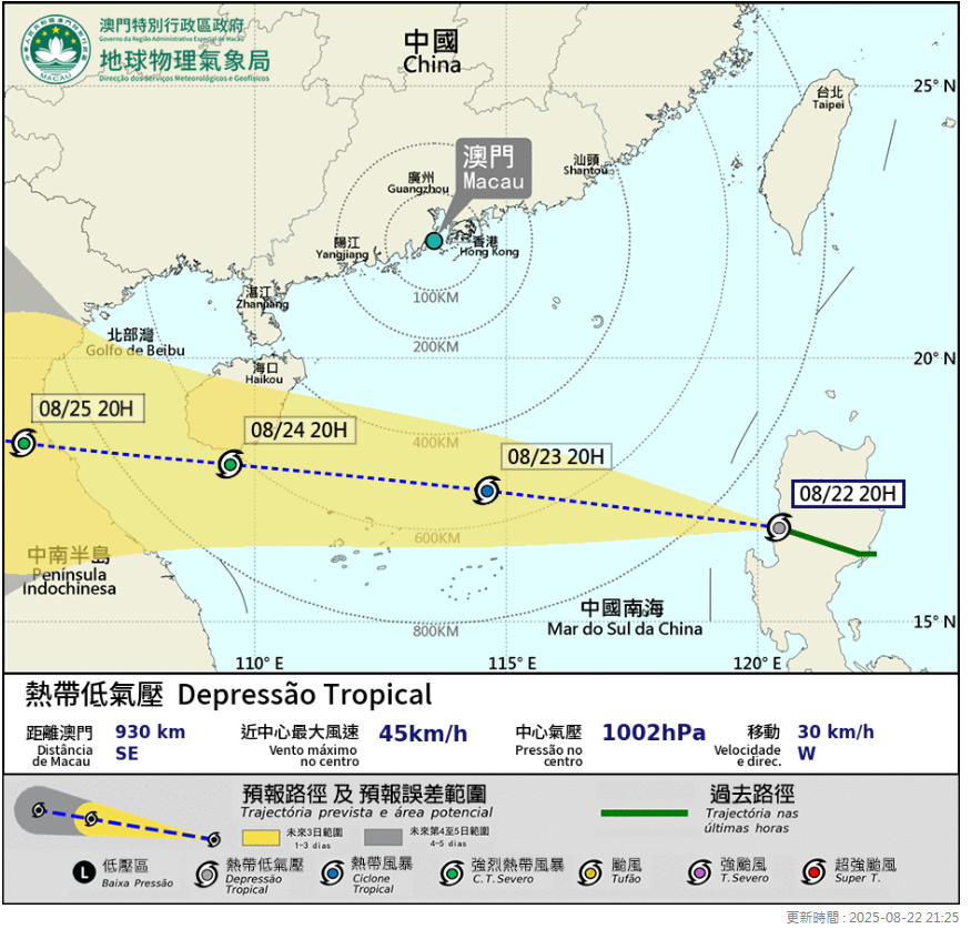 【本報訊】氣象局表示,位於呂宋以西的熱帶低氣壓即將進入本澳800公里範圍,氣象局於今晨01:00發出一號風球;按照現時預測路徑,該熱帶氣旋將採取偏西方向橫過南海北部,大致趨向海南島附近海域。