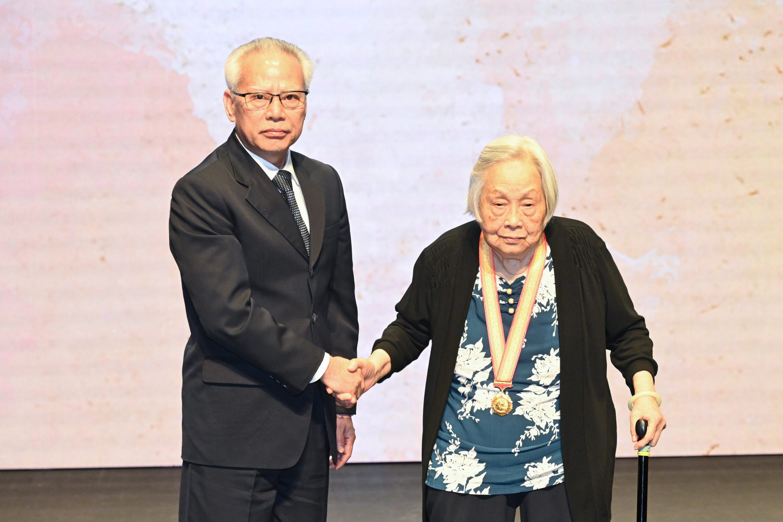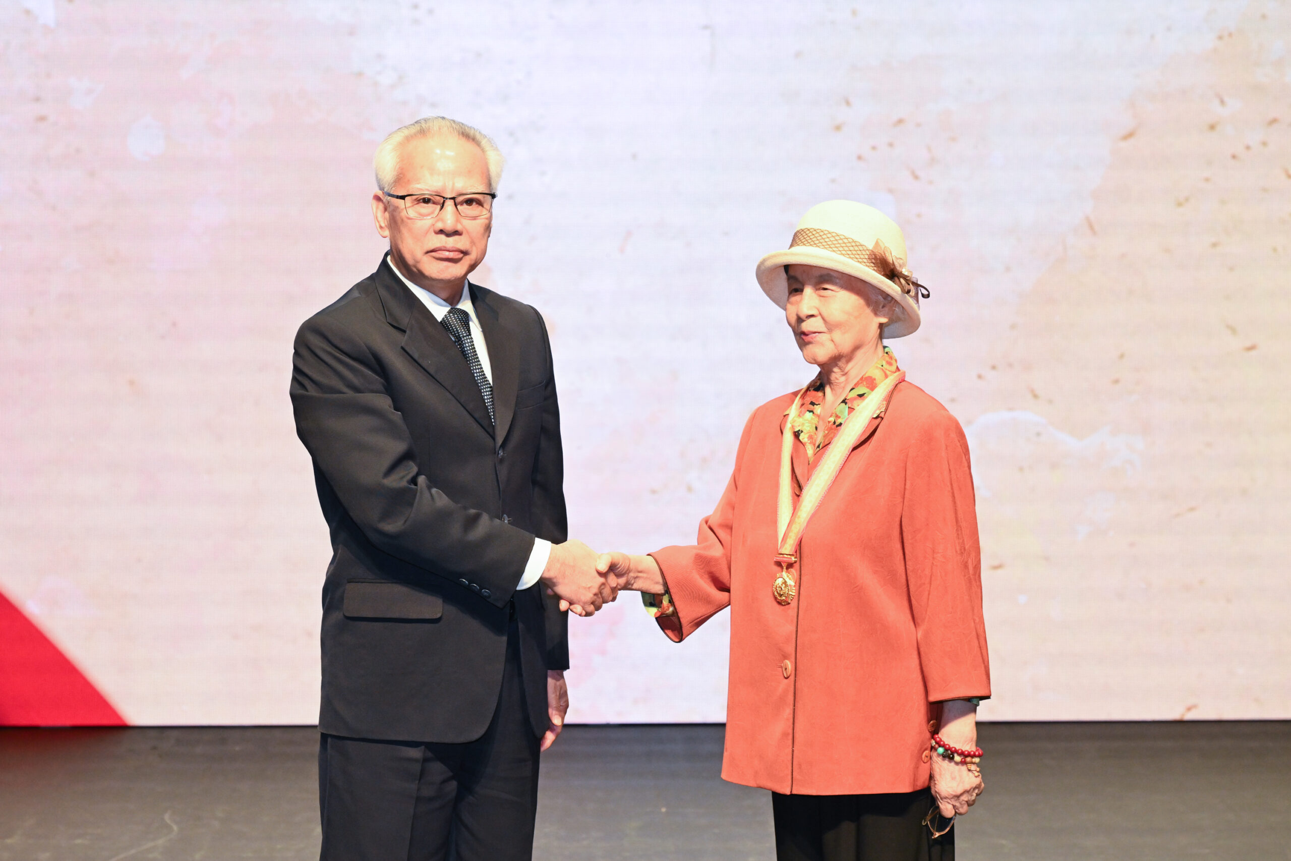 其後,岑浩輝向烈士家屬頒授紀念章,表彰先輩為國捐軀的英勇壯舉,體現國家對烈士家屬的崇高禮遇與深切關懷。獲頒紀念章的包括吳清華女士(吳豐宇烈士家屬)及梁鳳文女士(蔡俊烈士家屬)。