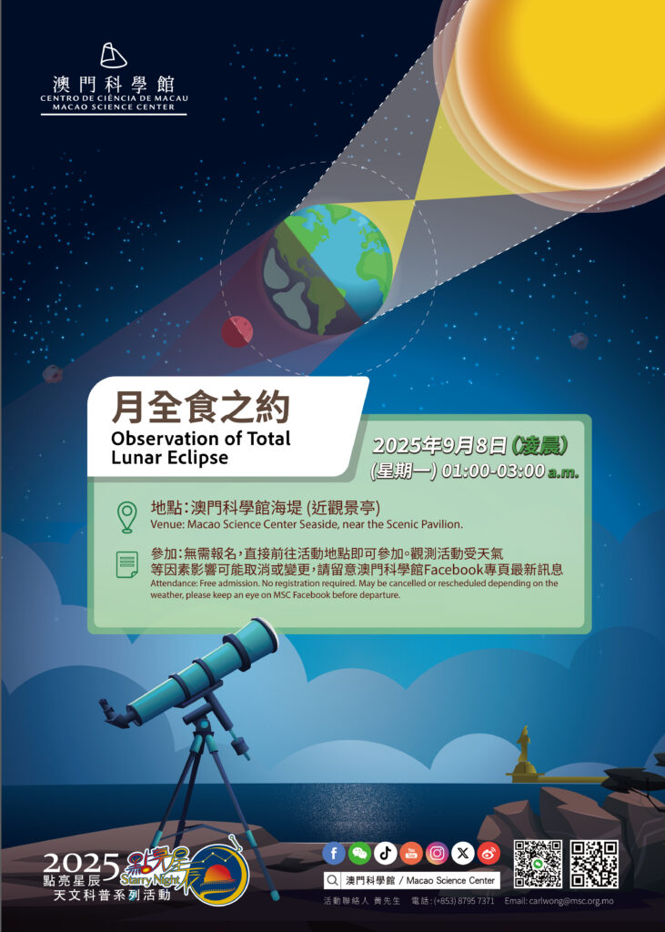 天文館將於9月定期推出「點亮星辰」天文科普系列活動,當中包括:8日凌晨1時在館外海堤舉辦「月全食之約」,屆時將提供天文望遠鏡讓公眾觀測月全食天象,並安排專人講解相關天文知識。「德州日食朝聖見聞錄」將於9月14日下午5時在天文館舉行,由天文館技術員黃嘉慶先生分享在美國德州追逐日全食的經歷與攝影技巧,讓公眾體驗「日月之行星漢燦爛」的別樣韻味。上述活動毋須報名,公眾可於活動當日到澳門科學館大堂售票處免費領取門票入場。此外,天文館已計劃於10月5日舉辦「從行星到宇宙—探索永無止境」科普球幕講座,詳情容後公佈,敬請留意。