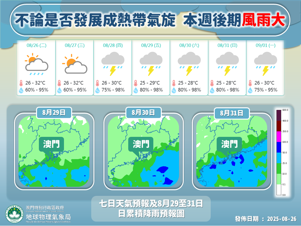 氣象局發出特別信息,預料受低壓區及一道高壓脊共同影響,本澳今明兩天(28至29日)會有驟雨及雷暴,雨勢有時頗大,呼籲市民留意最新天氣資訊。