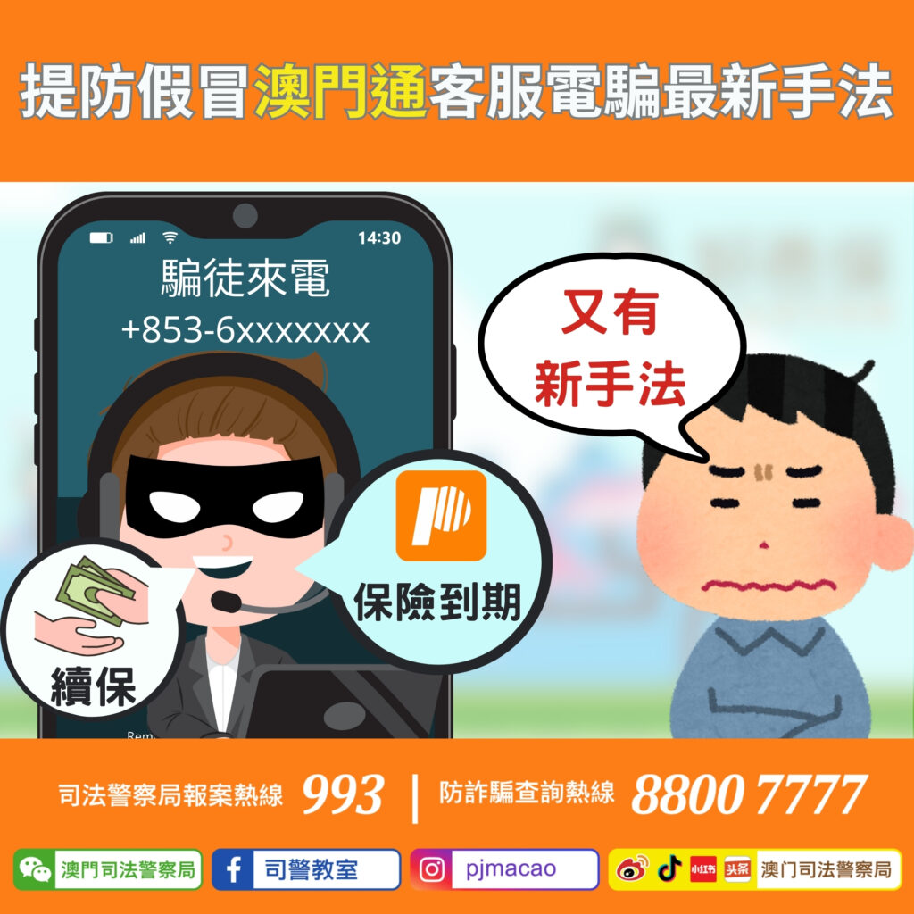 司警稱,昨日透過反詐程式及澳門通股份有限公司的通報,接獲市民提供的犯罪消息,指騙徒會以澳門流動電話號碼致電事主,並以普通話冒充「澳門通」客服人員,聲稱事主早前透過MPay開通的保險服務已到期,若未能依指示取消將被收取高額費用。及後,騙徒進一步要求事主提供銀行及信用卡資料,甚至下載應用程式進行手機同屏操作,或將資金轉賬至指定賬戶以作所謂驗證,企圖以各種手法誘使事主上當受騙。