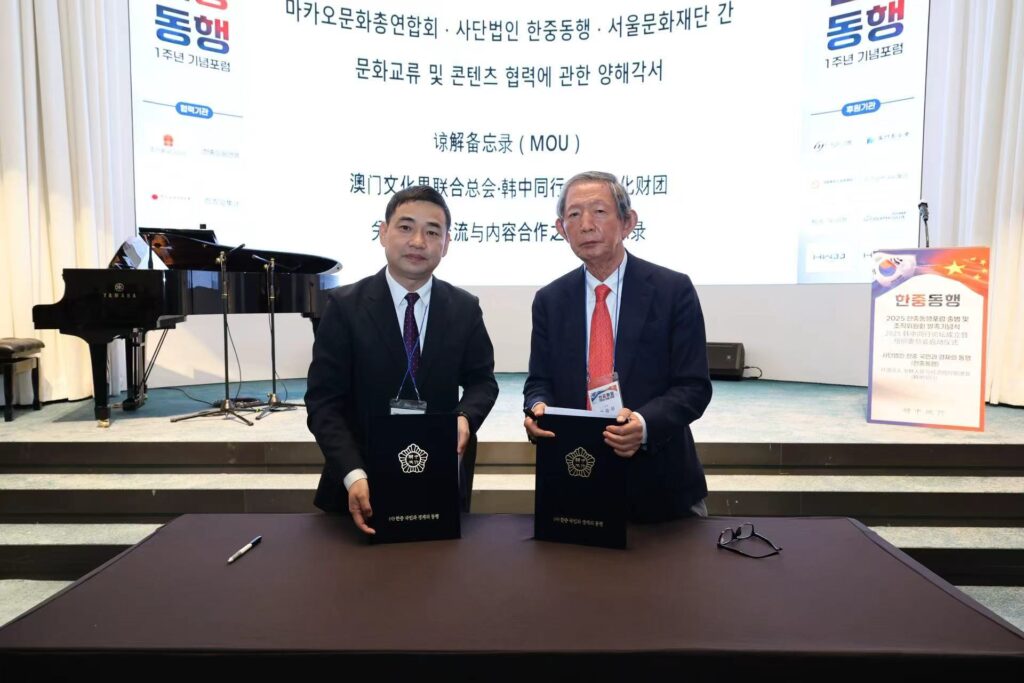 同場還舉行了韓中同行九個項目簽約儀式,其中,澳門文化界聯合總會與韓中同行簽署“關於文化交流與內容合作之諒解備忘錄”。李自松理事長代表澳門文化界聯合總會和韓中同行韓方安昇雨會長簽署了諒解備忘錄。