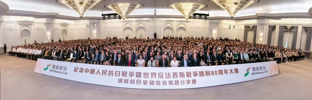 【本報訊】澳娛綜合度假股份有限公司昨日在澳門上葡京綜合度假村舉辦「紀念中國人民抗日戰爭暨世界反法西斯戰爭勝利80周年——澳娛綜合愛國專題分享會」,由常務董事何超鳳帶領,並邀請澳門工會聯合總會會長何雪卿及理事長李從正出席,與團隊成員分享國情。