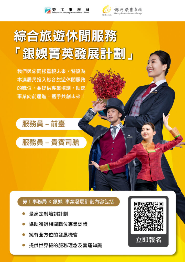 【本報訊】為支持本地人才全面發展,拓展多元職涯路向,勞工事務局(下稱勞工局)和銀河娛樂集團(下稱銀娛)合作推出「銀娛菁英發展計劃(酒店營運)」(下稱計劃),以「先入職、後培訓」方式,為有志投身酒店營運的澳門居民,提供全方位的培訓及事業發展機會,計劃由9月19日起接受申請。