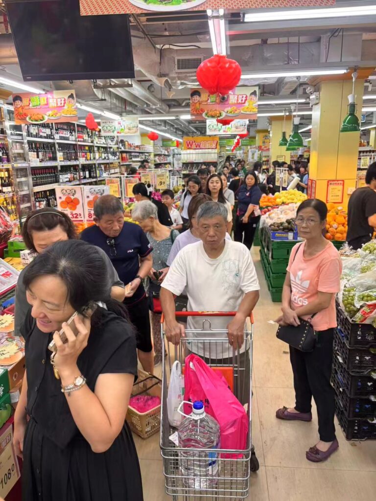 在紅街市及義字街一帶,人流暢旺,魚檔、凍肉檔生意格外火爆。凍肉檔檔主黃小姐表示,街市人流較平日增加近五成,不少市民專程前來購買凍肉儲備。為應對需求,其攤位已提前補足貨源。居民李女士表示,為應對即將到來的颱風,主要購買米、肉和新鮮蔬菜等,確保能滿足三兩天的需求。另備足水、藥品和其他應急物資,以防萬一,坦言對今次強颱風的來襲感到擔憂。