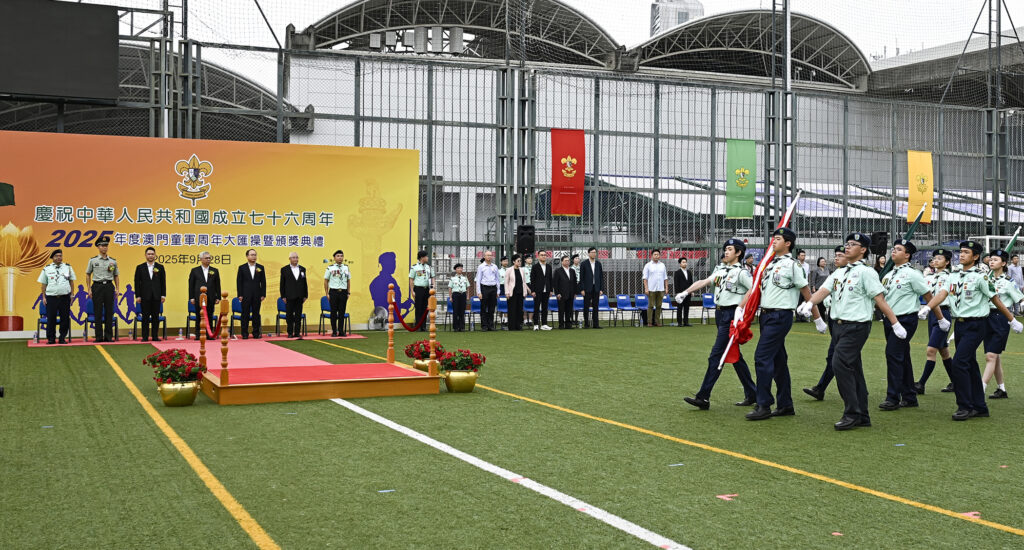 【本報訊】澳門童軍總會昨日下午在工人體育場舉辦2025年度澳門童軍週年大匯操暨頒獎典禮,以慶祝中華人民共和國成立76週年。活動設有升國旗儀式、閱兵式及童軍團呼表演等,並進行頒獎儀式,今年共有363人次獲獎。