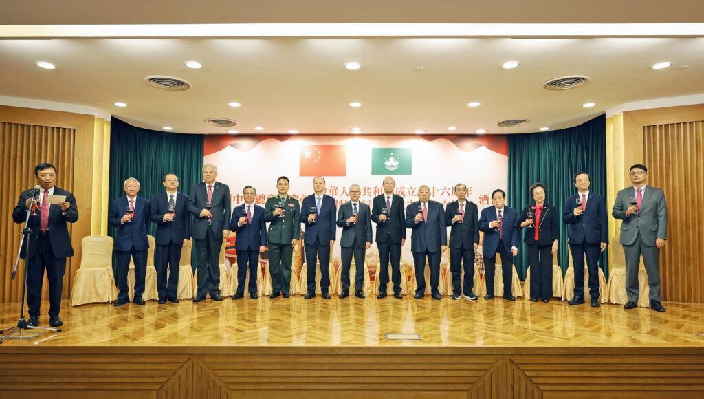 【本報訊】澳門中華總商會昨日舉行慶祝中華人民共和國成立76周年、澳門特區成立26周年酒會,行政長官岑浩輝、澳門中聯辦主任鄭新聰、外交部駐澳特派員公署特派員劉顯法、駐澳部隊副司令員戴勁松、立法會主席高開賢,澳門中華總商會永遠會長馬有禮、會長崔世昌以及逾四百名社會各界人士出席,場面熱鬧。