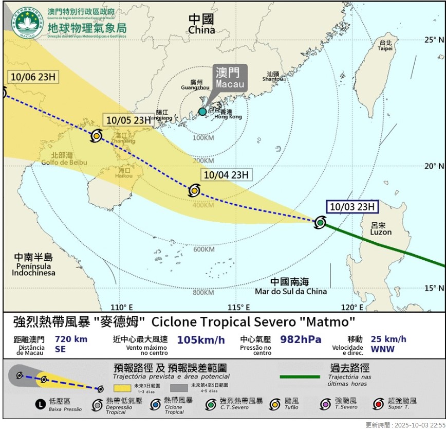 昨晚11時,強烈熱帶風暴「麥德姆」集結在澳門東南約720公里,以時速約25公里向西北偏西移動。氣象局表示,按現時預測路徑,熱帶氣旋「麥德姆」移動速度較快,大致趨向雷州半島至海南島一帶,有機會增強至颱風或以上級別。本澳週六(10月4日)下午開始風勢會顯著增強,間中有大驟雨,因此10月4日下午發出三號風球的機率為高,由於「麥德姆」在週日(10月5日)凌晨至早上最接近本澳時,本澳將位處其最大風力區域(8級風或以上)的邊緣,氣象局將視乎風力情況考慮發出更高級別熱帶氣旋信號。