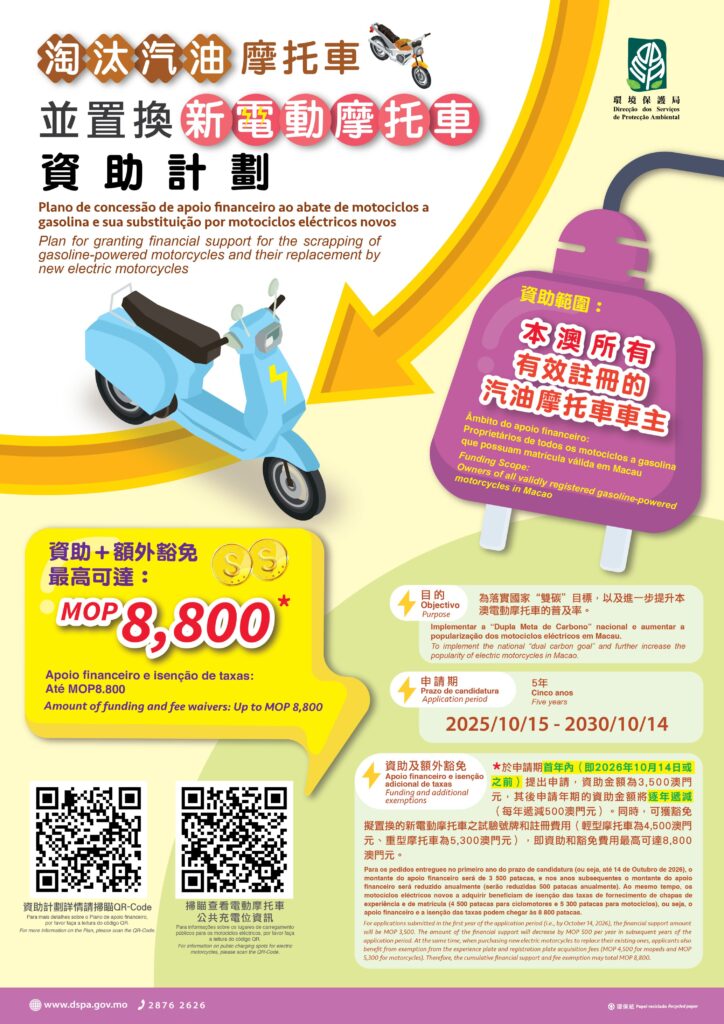 《淘汰汽油摩托車並置換新電動摩托車資助計劃》是配合國家實現「雙碳」目標的重要舉措,亦是特區政府本年度施政方針和「澳門電動車推廣計劃」的重點工作,申請期由2025年10月15日至2030年10月14日,為期五年。資助對象範圍擴大至所有在澳門特別行政區具備有效註冊的重型或輕型汽油電單車車主,但不包括在2025年10月6日或之後已被取消註冊且其後重新註冊的電單車車主,以及結欠澳門特別行政區債務的電單車車主。