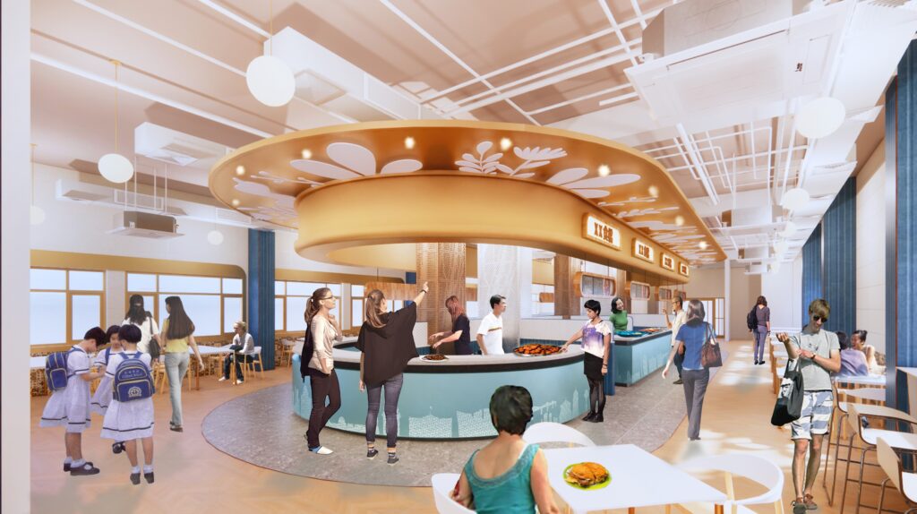 在空間設計方面,將保留原有的出入口,擴闊公共通道,增加攤檔面積,創建更舒適的營商環境及購物動線。其中,魚類攤檔將採用乾濕分離的設計,分隔售賣區和後勤區,並於售賣枱前增設擋板,擋水防濺。蔬菜及生果售賣區採用曲線設計,提高視覺寬敞度及貨品展示的靈活性。一樓熟食區除熟食攤位外,還有適合經營輕食的開放式中島設計攤位,為經營者及消費者提供多元、整潔的環境。