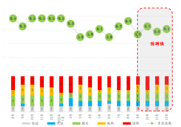 學會表示,九月旺季過後疊加颱風影響,與八月份形成較明顯落差。八月日均入境旅客高達13.6萬人次,酒店客房日均住客4.2萬人次,入住率達92.9%,這三項指標均達至指標體系的「過熱」等級。博彩業毛收入亦表現較好,八月日均博彩毛收入錄得7.14億澳門元,九月受超強颱風樺加沙吹襲導致所有娛樂場暫停營業33小時影響,略為回落至6.1億澳門元,但休企整體股價表現有所回升。此外,就業市場保持健康,總體失業率維持在2.0%的低失業率等級。然而,內需與投資信心疲弱仍疲弱,「內地消費者信心指數」以及「本地居民貸存比」分別處於「低迷」及「欠佳」等級。本澳住宅樓價指數亦跌至192.4點,自六月起落入「低迷」等級,並持續創下近十年來的新低。經綜合分析與推算,八、九月份的經濟景氣指數分別為6.4分及5.9分,整體維持「穩定」等級。