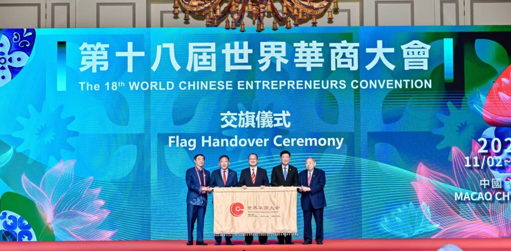 在閉幕式上,崔世昌、蔡冠深、高泉慶、林楚欽、唐振剛進行世界華商大會會旗交接儀式。此外,馬志毅代表大會分別向同善堂、鏡湖慈善會捐款各十萬澳門元,藉此支持本澳慈善事業發展。