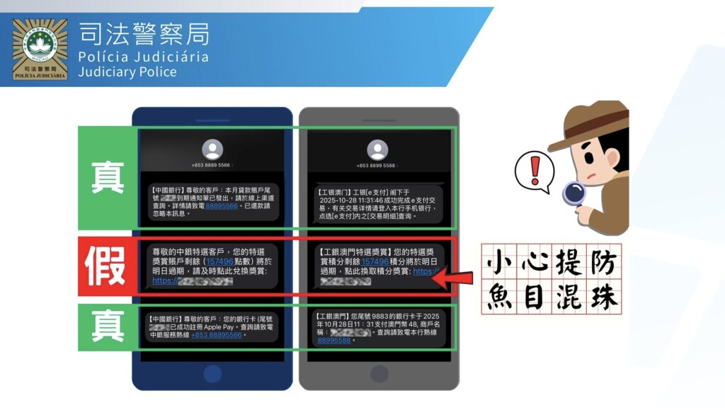 司警表示,騙徒的作案手法主要為假冒本澳不同銀行並以「積分到期」為名發出釣魚短訊,短訊內附有「假銀行網站」連結,誘使市民點入連結及提供個人、銀行卡資料、驗證碼以換取禮物,從而利用套取所得的資料大額消費,市民稍一不慎便會上當受騙。對此,本澳多家銀行已發出聲明,提醒市民銀行不會以短訊連結要求客戶登入網站交易及索取個人資料,司警亦已透過電訊營運商對相關釣魚網站進行阻截。