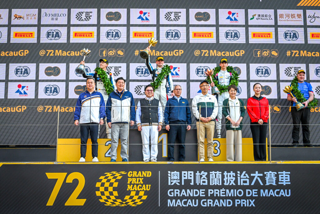 【本報訊】第72屆澳門格蘭披治大賽車國際汽聯 FR世界盃,6號法國車手奈爾憑著在賽事尾段把握機會發動攻勢,成功進佔頭位並率先衝線,贏得冠軍,原本領先的7號西班牙車手寶雅落到第二獲得亞軍,另一名5號法國車手迪利尼則摘得季軍。行政長官岑浩輝向三甲車手頒發獎盃。