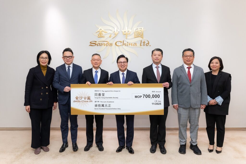 【本報訊】金沙中國有限公司於11月20日在澳門威尼斯人®舉行支票捐贈儀式,向澳門同善堂捐贈澳門幣70萬元,連續22年響應該社服機構的年度「沿門勸捐」籌款活動,全力支持同善堂各項慈善服務推展。