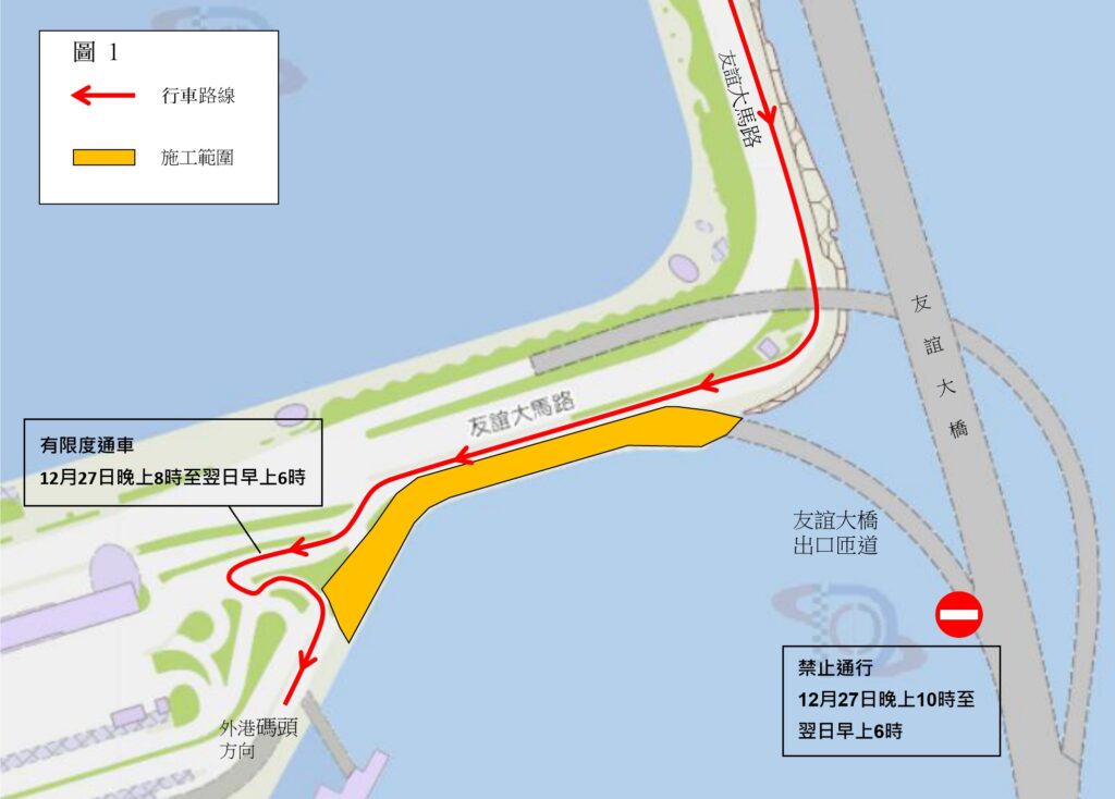 另外,因應A3橋進行匝道樁基礎施工,自2025年12月30日起至2026年2月,近外港碼頭的一段友誼大馬路將使用新建道路,並實施有限度通車。