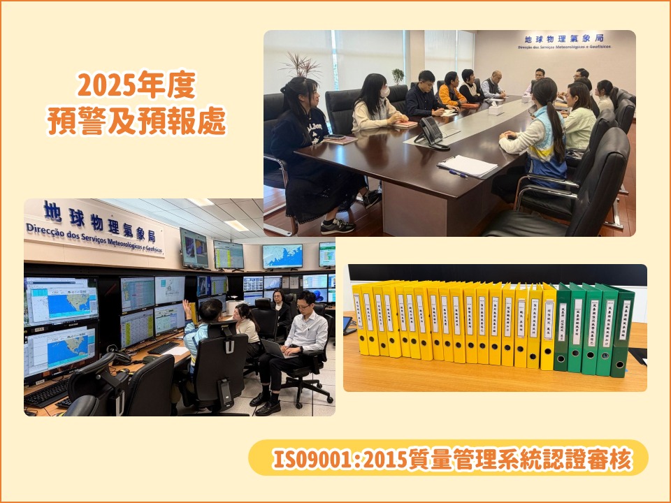 而預警及預報處已於11月28日完成認證審核,並在認證範圍「提供熱帶氣旋信號及風暴潮警告發佈服務」亦順利通過審核,標誌著本局熱帶氣旋及風暴潮預警服務的作業流程具備系統化的質量保證。