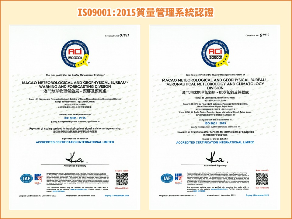 澳門地球物理氣象局「力行科學,保民為諾」的服務宗旨,以「ISO 9001質量管理系統」為框架,持續不斷完善和優化各項氣象服務的流程與標準,致力為澳門市民、航空業界及各服務對象提供更優質的氣象服務。