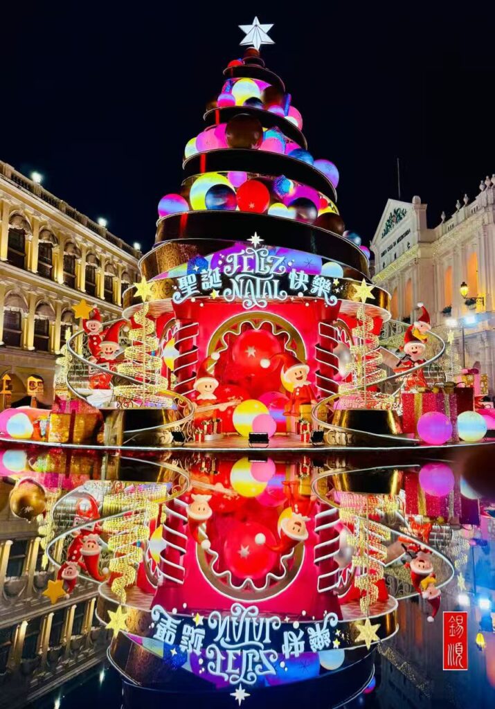 昨日下午,中區議事亭前地人潮絡繹,絢麗裝飾與熱鬧氛圍相映成趣。巨型聖誕樹鑲滿靚麗球飾,環繞聖誕老人與精靈裝置,吸引眾人駐足觀看。熱門旅遊景點大三巴人流暢旺。