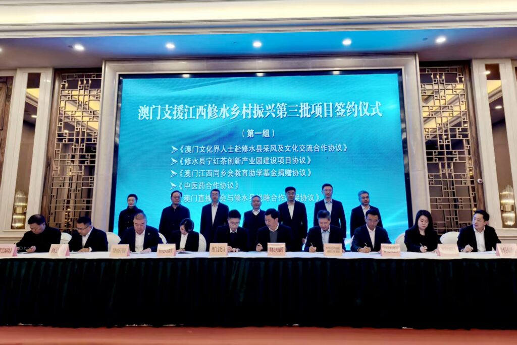 【本報訊】2025年12月30日上午,澳門支援江西修水鄉村振興第三批項目簽約儀式舉行。澳門特別行政區政府政策研究和區域發展局局長張作文,中央人民政府駐澳門特別行政區聯絡辦公室經濟金融部副部長楊全州,江西省蘇區辦副主任傅小鵬,江西省港澳辦副主任陳俊,九江市政府副市長杜少華,修水縣委書記鄭慶華,修水縣委副書記、縣長劉婕出席,出席簽約儀式的還有澳門特區政府政策研究和區域發展局、澳門中聯辦經濟金融部、澳門特區政府文化局、澳門蔬菜批發商商會、澳門直播協會、澳門江西同鄉會、澳門記者聯會、澳門部分優秀企業和省發改委、省港澳辦等單位有關領導和嘉賓。簽約儀式由劉婕主持。