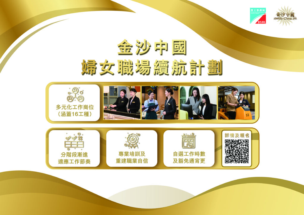 【本報訊】為協助因照顧家庭或個人原因離開職場的婦女,逐步重建職業能力與信心,順利續航職場,勞工事務局(下稱「勞工局」)和金沙中國有限公司(下稱「金沙中國」)合作推出「金沙中國婦女職場續航計劃」(下稱「計劃」)。是次計劃將結合小組支援、專業培訓、工作實踐以及彈性工作時數安排等措施,讓已離開職場的婦女,逐步適應工作環境,續航職場。有意參加者可於今(6)日起至1月16日期間網上遞交申請。