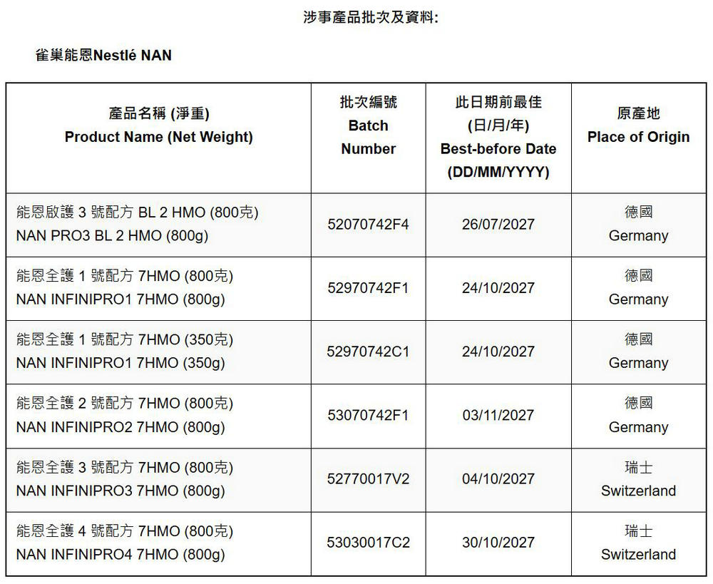 是次涉及雀巢公司旗下雀巢能恩及惠氏營養品兩個品牌的多款產品。藥物監督管理局和市政署呼籲,若持有相關產品的業界應立即停止出售。此外,為審慎起見,不論透過網購、代購或其他途徑購入,市民亦不應讓嬰幼兒食用受影響批次的產品,若嬰幼兒食用涉事產品後出現不適情況,應儘快求醫。如對相關產品有任何疑問,可致食安專線28338181了解。