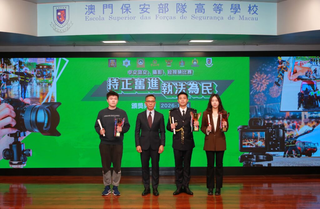【本報訊】由澳門保安部隊及保安部門合辦、澳門保安部隊高等學校(下稱「保安高校」)承辦的「持正奮進執法為民」中文徵文、攝影及短視頻比賽,昨日在保安高校舉行頒奬禮。保安司司長陳子勁擔任主禮嘉賓,並邀請中聯辦警務聯絡部部長王前進、員警總局局長梁文昌、澳門海關關長何浩瀚、校董會成員、保安部隊及保安部門各領導、學術及教學委員會成員、賽事評委、各組別的得獎者,以及高等院校和中學代表等約180人出席,共同觀賞各位得獎者的精彩作品和見證榮耀時刻。