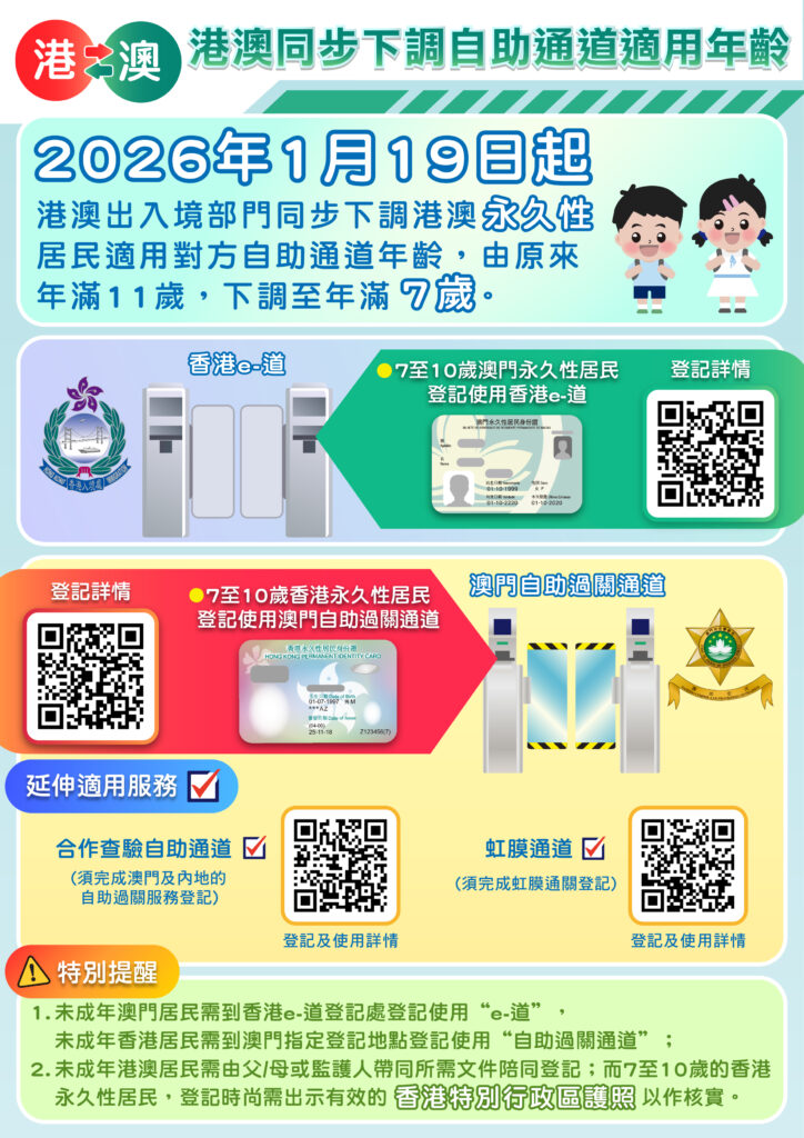 【本報訊】政府表示,為貫徹落實《粵港澳大灣區發展規劃綱要》,積極參與大灣區建設,治安警察局、身份證明局、澳門保安部隊事務局與香港入境事務處持續聯手優化港澳通關便利措施。上述部門共同決定,自2026年1月19日起,港澳兩地永久性居民使用對方自助過關通道(即香港的e-道及澳門的傳統兩門式自助通道),適用年齡由原來的年滿11歲,下調至年滿7歲;另外,兩地年滿18歲的合資格非永久性居民可使用本地自助服務機進行預先登記,成功登記後約3小時即可使用對方自助過關通道(香港的e-道及澳門的傳統兩門式自助通道)入出境。