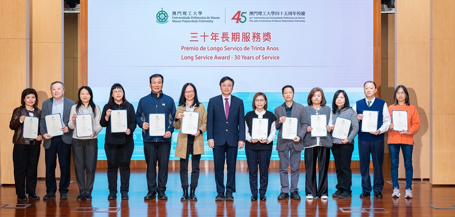 【本報訊】為表彰長期服務員工的卓越貢獻與教學創新教師的傑出表現,澳門理工大學舉行「長期服務獎暨優秀教學獎頒獎典禮」,向於澳理大服務滿10年、20年及30年的員工頒發「長期服務獎」以及向獲獎教師頒發「線上教學優秀案例獎」。澳理大行政管理委員會成員、學術及行政單位主管,以及教職員工共200多人出席,場面歡欣感人。