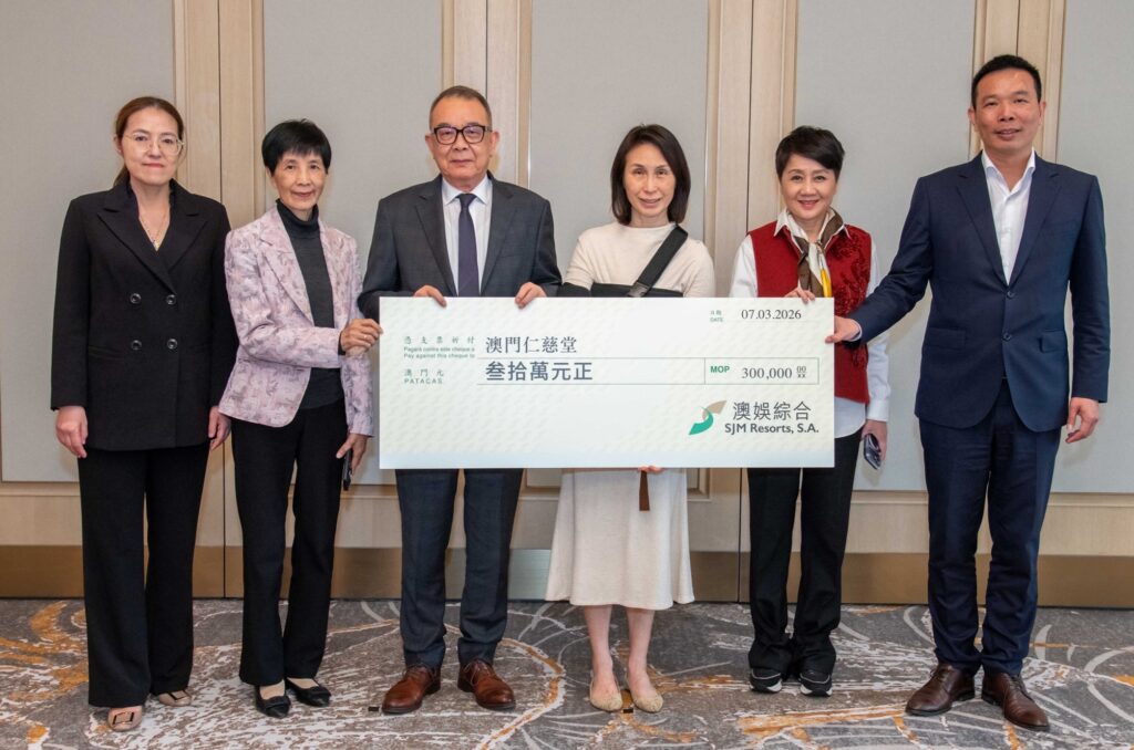 在日前舉行的捐贈儀式上,澳娛綜合常務董事何超鳳代表公司致送善款支票,澳門仁慈堂值理會主席飛安達代表接受。