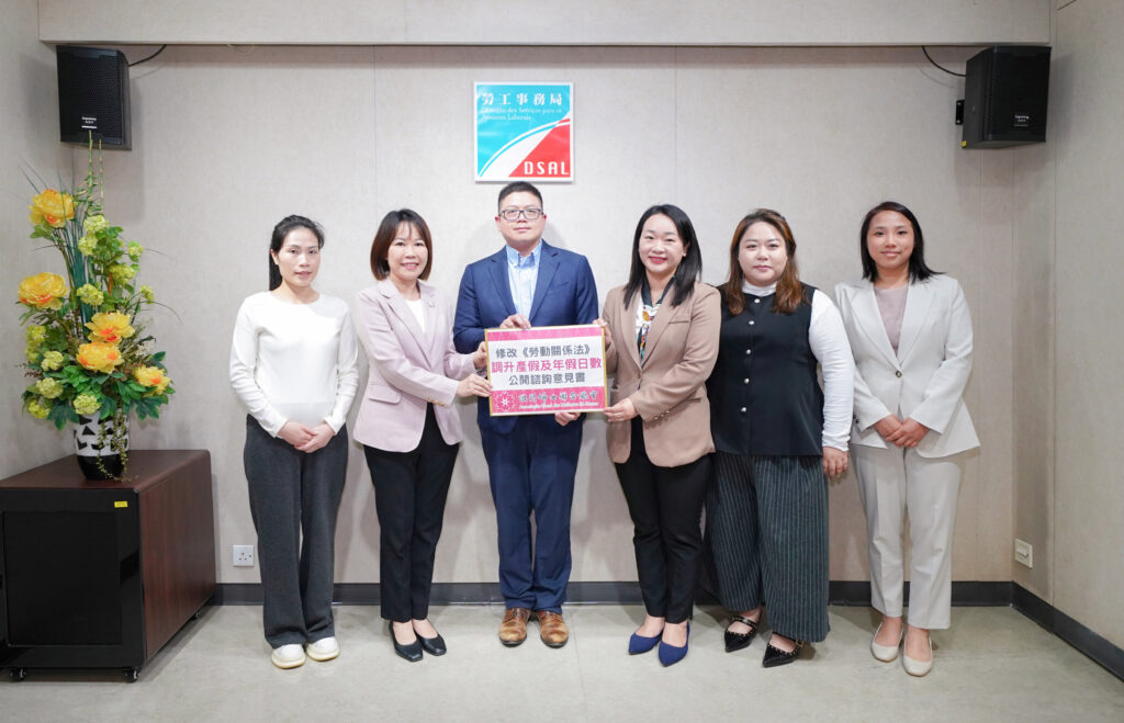 【本報訊】立法議員、婦聯副會長黃潔貞、立法議員、婦聯副理事長呂綺穎、副理事長歐陽月勝等一行於昨日赴勞工局遞交修改《勞動關係法》意見書,獲副局長陳俊宇代表接收。多年來婦聯持續推動建設生育友好型社會的相關法律和措施,樂見本次修法諮詢提出有薪產假調升至九十日及調整年假等措施,回應女性勞動權益保障、中小微企成本負擔及家庭發展的現實需求。