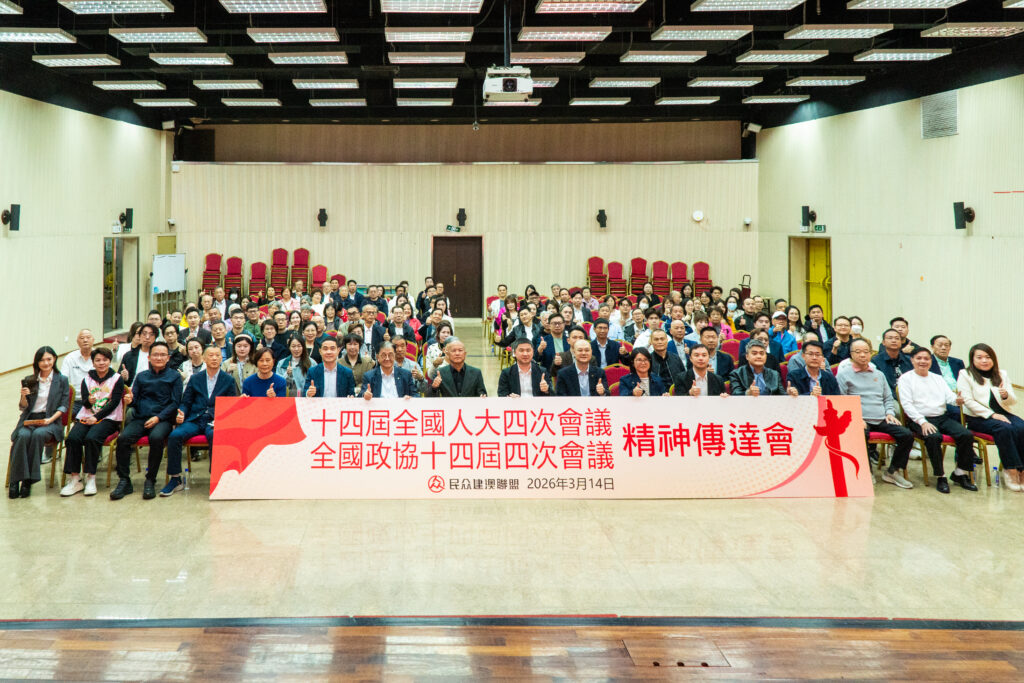 【本報訊】民眾建澳聯盟聯同一百四十二個友好社團及機構,日前假民建聯黑沙環總部禮堂舉辦「十四屆全國人大四次會議、全國政協十四屆四次會議精神傳達會」。中央人民政府駐澳門特別行政區聯絡辦公室協調部副處長辜智欽應邀出席,澳區全國政協委員陳明金及澳區全國人大代表施家倫傳達「兩會」精神。民建聯創會主席吳在權、理事長李良汪、副主席宋碧琪、陳禮祺,該會一眾理監事及會員,以及一百多個社團與機構主要負責人等逾二百人出席。會議由民建聯常務理事唐可嵐主持。