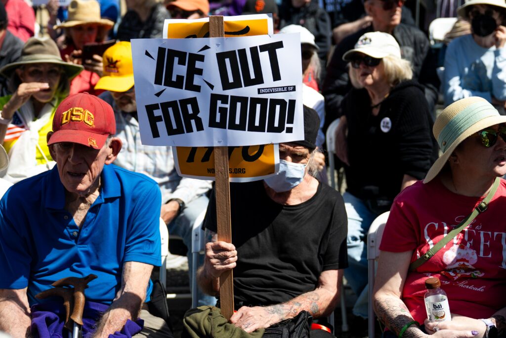 在西海岸的三藩市,數千民眾走上街頭,抗議特朗普政府粗暴的移民政策,呼籲結束美以伊戰爭。