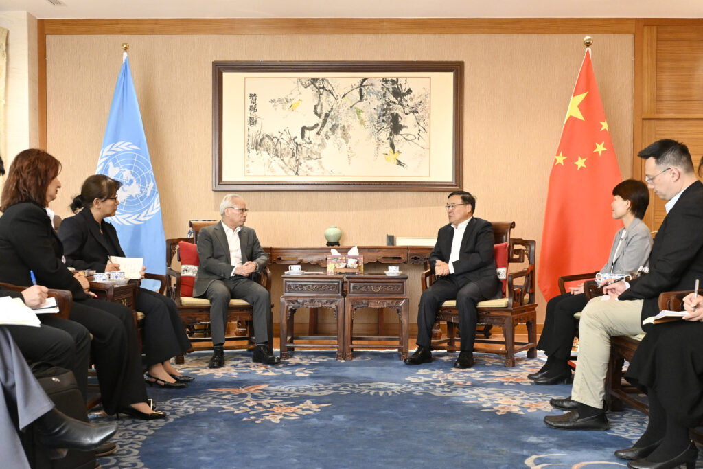 賈桂德歡迎行政長官到訪,並介紹中國常駐日內瓦代表團的功能及運作模式。他指出,代表團為國家根本利益服務,澳門是國家其中一個特別行政區,成功實踐「一國兩制」、「澳人治澳」、高度自治方針,具備獨特的國際平台作用,並積極參與不同的國際組織,有效助力國家高水平對外開放。在此基礎上,代表團將進一步支持澳門特區開展對外合作。